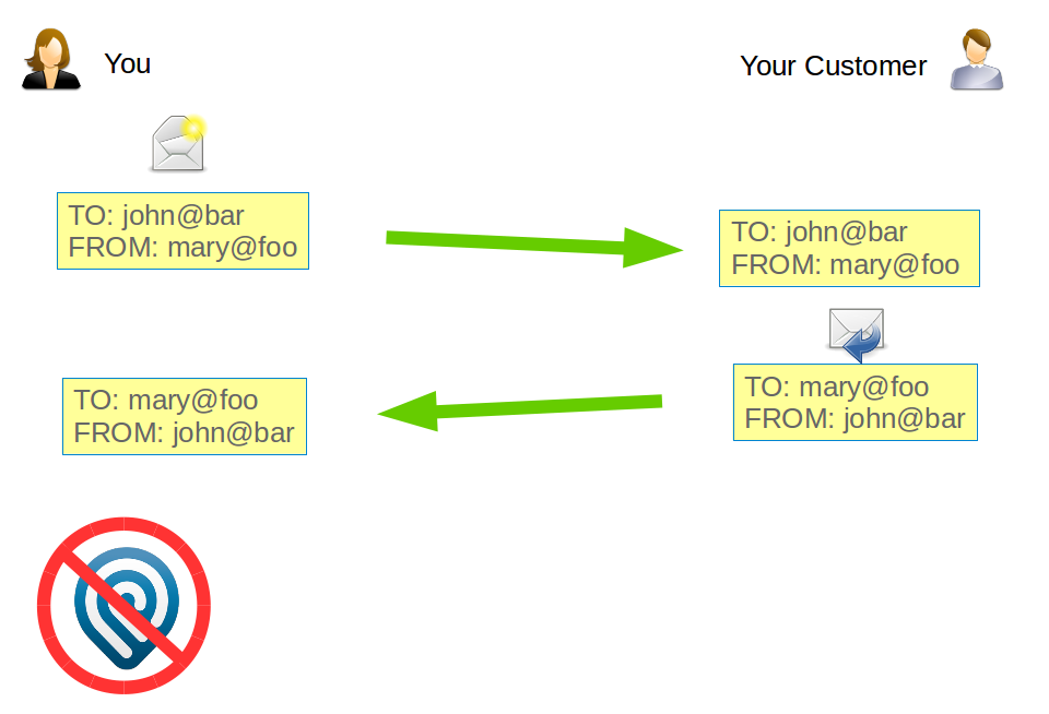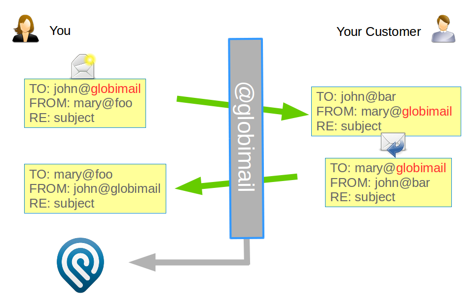 With GlobiMail, the default settings use Email Address Mapping. All emails are routed through our servers by changing the FROM and TO addresses of each message as we route them.