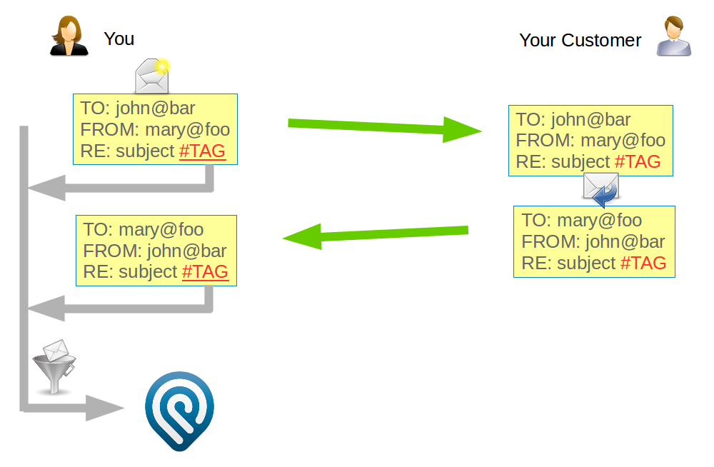 With GlobiMail's Subject Tagging, all emails receive a unique identifier in the subject, and you need to set up a mail forwarding filter to forward copies of tagged messages to us.