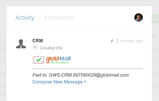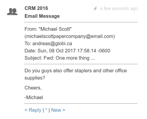 Notice the comment that GlobiMail added to the Item already, complete with a Link to start Composing a New Message