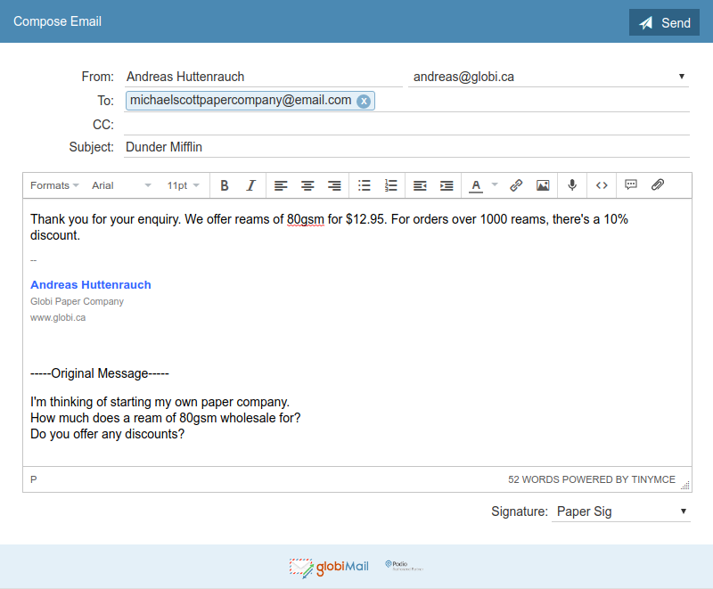 I'm sure we've all seen email chains get very long. Notice how GlobiMail tries to prevent clutter in your Podio Workspace by removing signatures and any historical details of your email message.